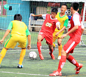 Cầu thủ đội THCS TP HCM đi bóng trước sự truy cản của cầu thủ Đồng Tháp. Trận đấu kết thúc hòa 2-2 trong ngày khai mạc. Ảnh: Minh Thảo