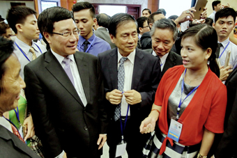 Phó Thủ tướng, Bộ trưởng Bộ Ngoại giao Phạm Bình Minh gặp gỡ các đại biểu kiều bào tại hội nghị. Ảnh: Thế Anh - TTXVN |
