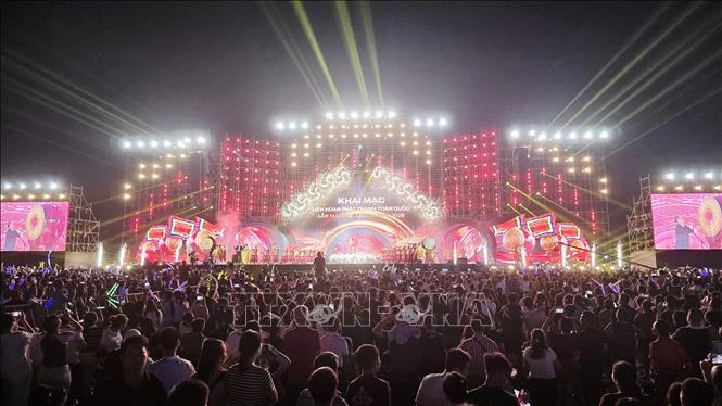 Đông đảo nhân dân và du khách theo dõi chương trình nghệ thuật đặc sắc trong đêm khai mạc tại vùng đất di sản. Ảnh: Thanh Vân/TTXVN