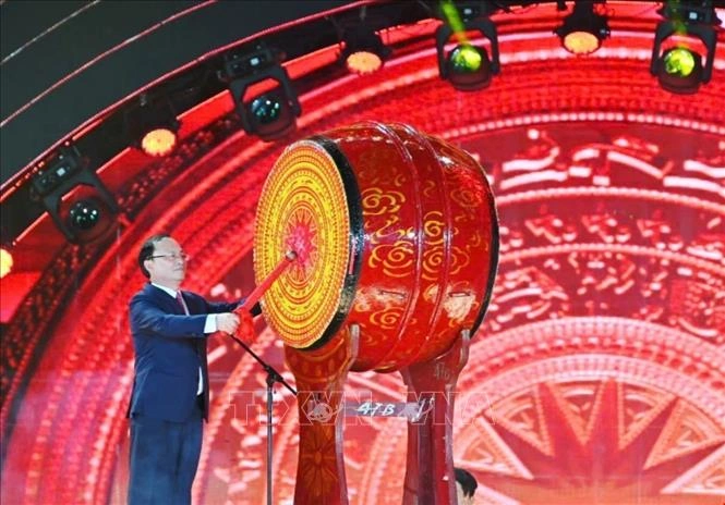Ủy viên Trung ương Đảng, Tổng Giám đốc Đài Tiếng nói Việt Nam Đỗ Tiến Sỹ đánh trống khai mạc Liên hoan Phát thanh toàn quốc lần thứ XVII. Ảnh: Thanh Vân/TTXVN