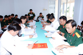 Các đại biểu Đảng bộ Quân sự thành phố và Đảng bộ huyện Cờ Đỏ thảo luận, đóng góp vào các dự thảo Văn kiện chuẩn bị trình Đại hội đại biểu Đảng bộ TP Cần Thơ lần thứ XII, nhiệm kỳ 2010-2015. Ảnh: X. Đ |