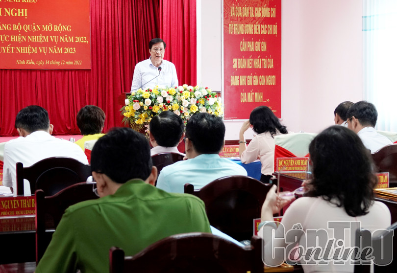 Phát biểu chỉ đạo hội nghị, đồng chí Phạm Văn Hiểu đề nghị lãnh đạo quận Ninh Kiều quan tâm giáo dục chính trị tư tưởng cho cán bộ, đảng viên; thực hiện tốt công tác quy hoạch gắn với đào tạo, bồi dưỡng cán bộ; nâng cao chất lượng, hiệu quả công tác kiểm tra, giám sát; tăng cường kiểm tra các hoạt động công vụ; lãnh đạo hệ thống dân vận, Mặt trận, các đoàn thể thực hiện tốt công tác giám sát và phản biện xã hội, góp ý xây dựng Đảng, xây dựng chính quyền trong sạch, vững mạnh. Đồng thời, đề nghị quận tiếp tục khai thác, phát huy tối đa vị trí, tiềm năng, lợi thế của quận để đẩy mạnh phát triển kinh tế; phối hợp chặt chẽ các ngành chức năng thực hiện tốt công tác quản lý nhà nước về lĩnh vực quản lý đô thị, đất đai, trật tự, kỷ cương, văn minh đô thị; tiếp tục thực hiện tốt công tác an sinh xã hội, góp phần nâng cao chất lượng cuộc sống nhân dân; thực hiện tốt công tác quốc phòng, đảm bảo an ninh chính trị, trật tự an toàn xã hội trên địa bàn. Quận cần tập trung lãnh đạo, chỉ đạo các đơn vị, địa phương tổng kết năm 2022 và xây dựng nghị quyết, kế hoạch năm 2023 sát hợp tình hình thực tiễn; chuẩn bị tổ chức tốt các hoạt động đón Tết Nguyên đán Quý Mão năm 2023.