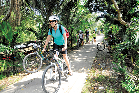 Du khách nước ngoài tham quan làng cổ ở huyện Cái Bè bằng xe đạp.