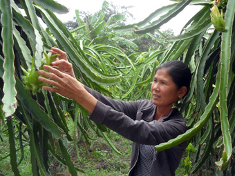 Bà Tám chăm bón vườn thanh long đang ra trái. |