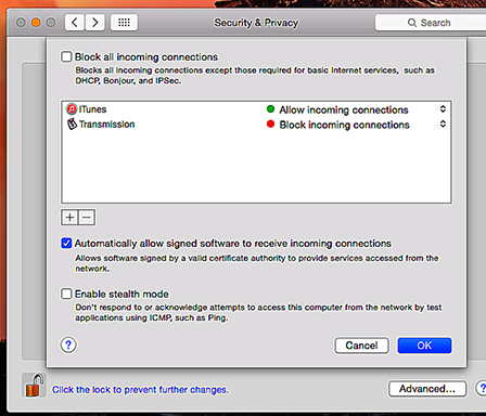 Các thiết lập mặc định là "tự động cho phép phần mềm xác nhận các kết nối gởi đến", có nghĩa là tất cả các ứng dụng của Apple trên máy tính Mac, các ứng dụng từ cửa hàng ứng dụng (App Store), và ứng dụng khác được xác nhận cho phép thông qua cổng GateKeeper của máy Mac sẽ được phép nhận các kết nối mà không cần hỏi ý kiến của bạn.