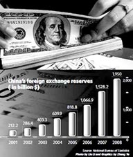 Biểu đồ tăng trưởng dự trữ ngoại hối của Trung Quốc. Hiện khoảng 50% số tiền này được đầu tư vào trái phiếu chính phủ Mỹ. |