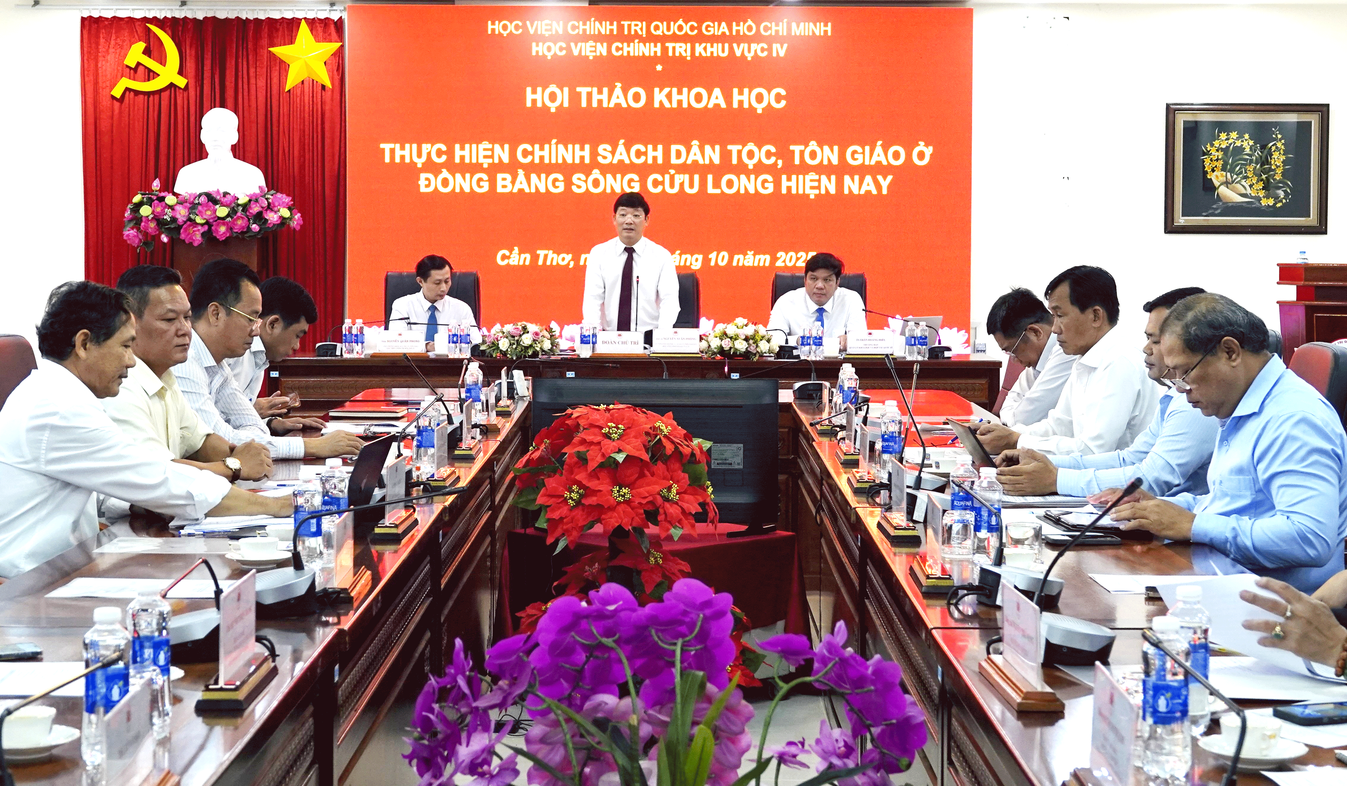 សាស្ត្រាចារ្យរង បណ្ឌិត ង្វៀងស្វឹងផុង នាយករងនៃវិទ្យាស្ថាននយោបាយតំបន់៤; បណ្ឌិតត្រឹងហ្វាងហ៊ីវ ប្រធានគណៈគ្រប់គ្រងវិទ្យាសាស្ត្រនិងសហប្រតិបត្តិការអន្តរជាតិ វិទ្យាស្ថាននយោបាយតំបន់៤; មហាបរិញ្ញា ង្វៀងក្វឹងផុង អនុប្រធានផ្នែកជនជាតិនិងសាសនា វិទ្យាស្ថាននយោបាយតំបន់៤ ជាអធិបតីក្នុងអង្គសិក្ខាសាលា។