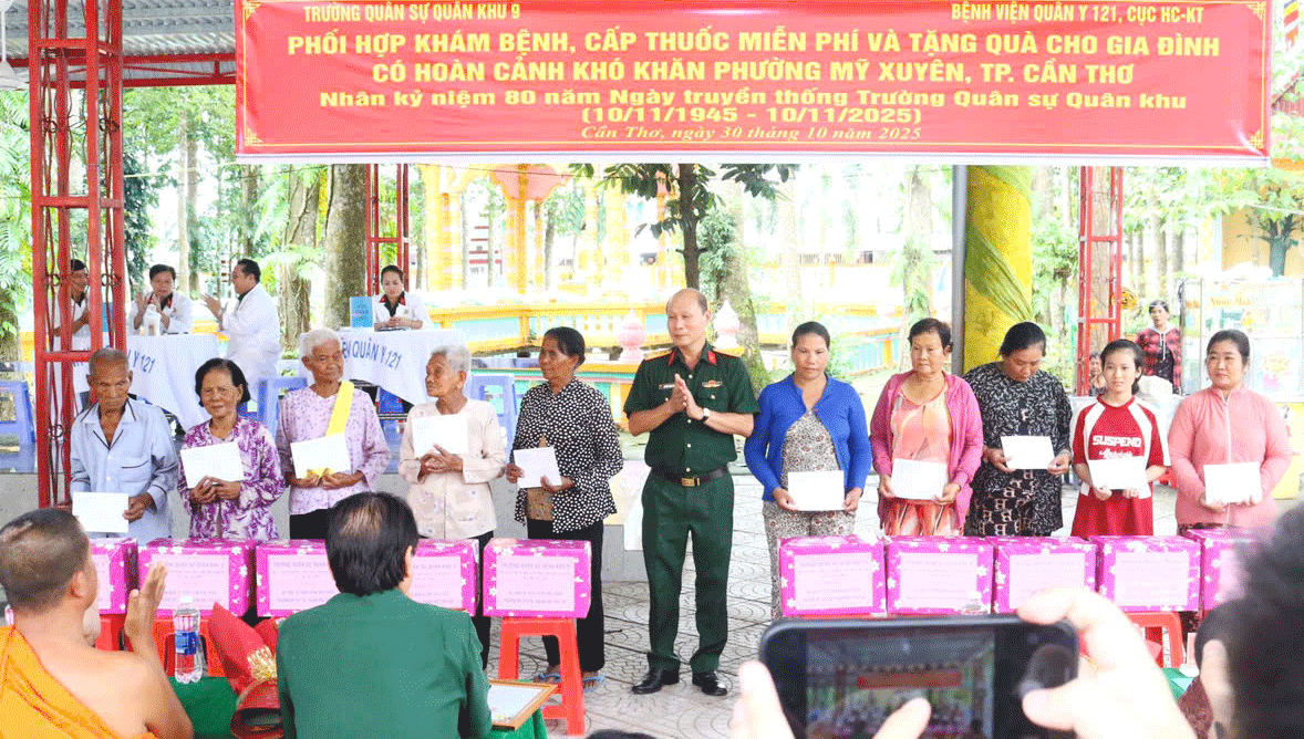 សាលាយោធានៃយោធភូមិភាគ៩ បានសហការជាមួយមន្ទីរពេទ្យយោធា១២១ ចាត់តាំងកម្មវិធីពិនិត្យជំងឺ ផ្តល់ថ្នាំពេទ្យដោយឥតគិតថ្លៃ ព្រមទាំងជូនអំណោយដល់គ្រួសារដែលមានជីវភាពលំបាកនៅសង្កាត់មីស្វៀង (ទីក្រុងកឹងធើ)។