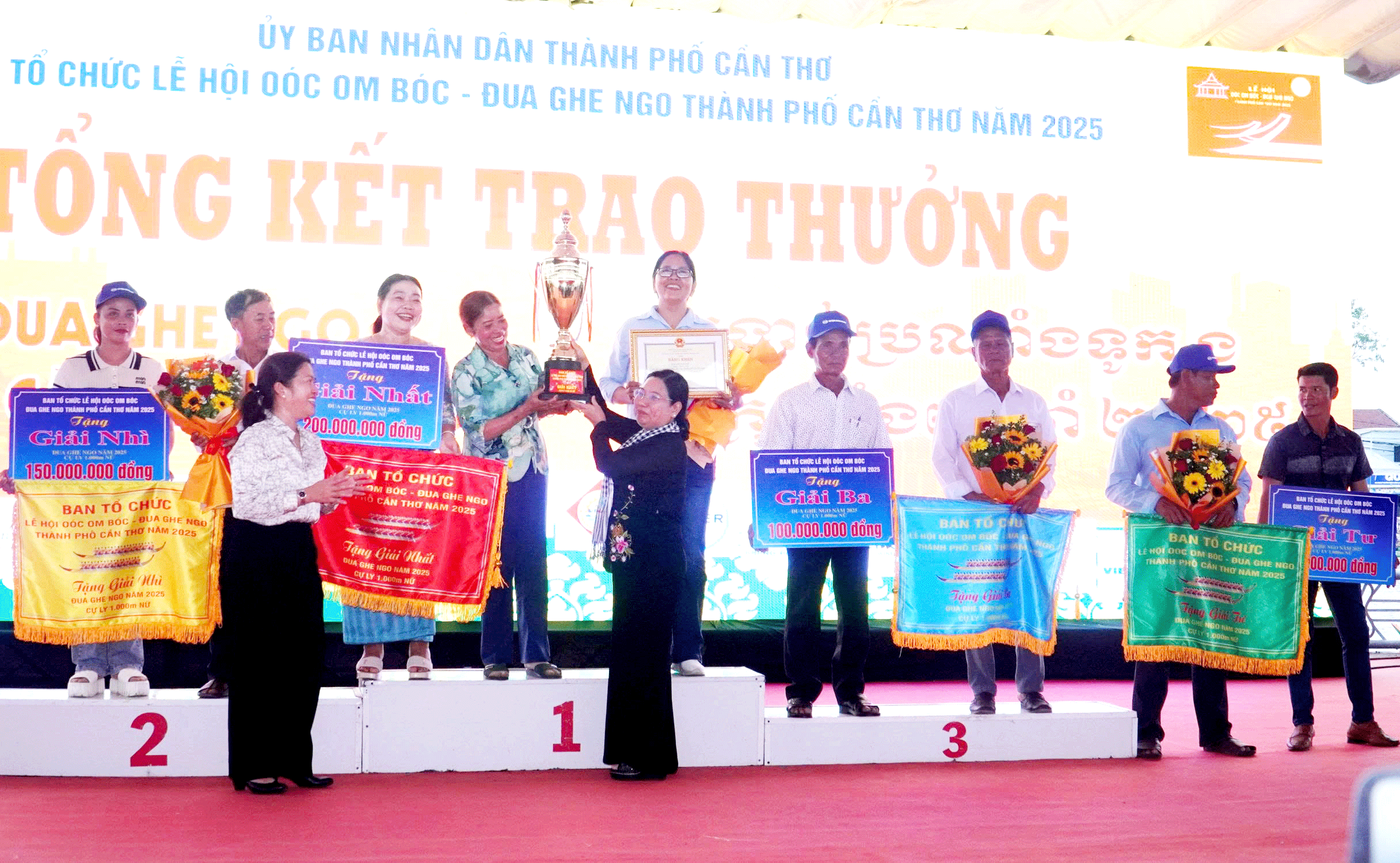 ថ្នាក់ដឹកនាំទីក្រុងកឹងធើ ជូនរង្វាន់ដល់ក្រុមទូក ងនារីដែលទទួលបានស្នាដៃខ្ពស់។