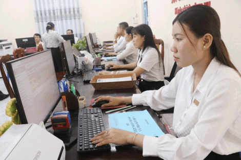 ដំណាក់កាល ២០២៨-២០៣០ ខិតខំ ១០០% ស្ថាប័នរដ្ឋផ្តល់ទិន្នន័យបើកត្រូវតាមស្តង់ដារ។ រូបថត៖ បុគ្គលិកនៃមជ្ឈមណ្ឌលបម្រើសេវារដ្ឋបាលឃុំកូវឡាវយុង ទទួលនិងដោះស្រាយសំណុំបែបបទតាមប្រព័ន្ធអនឡាញ។