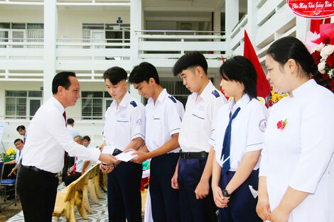 លោក ផាមវុាំងទេវ អនុលេខាគណៈកម្មាធិការបក្សខេត្ត ប្រធានក្រុមប្រឹក្សាប្រជាជនខេត្តកាម៉ាវ ជូនអាហារូបករណ៍ដល់សិស្សានុសិស្ស។