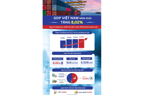 ឆ្នាំ ២០២៥ សេដ្ឋកិច្ចវៀតណាមបានកត់ត្រានូវជំហានកំណើនយ៉ាងផ្លោះ ដោយផលិតផលសរុបក្នុងប្រទេស (GDP) កើនឡើង ៨,០២% ដែលជាកម្រិតខ្ពស់ទីពីរក្នុងដំណាក់កាលឆ្នាំ ២០១១ - ២០២៥ គ្រាន់តែឈរក្រោយឆ្នាំ ២០២២ ប៉ុណ្ណោះ។
