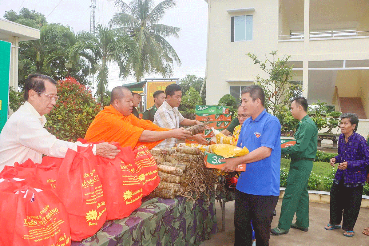 ព្រះ​សង្ឃ​និង​កម្មា​ភិបាល​ប៉ុស្តិ៍​ការ​ពារ​ព្រំ​ដែន​ ជូន​អំ​ណោយ​ដល់​គ្រួ​សារ​ក្រ​នៅ​ឃុំ​វិញ​ហាយ​។