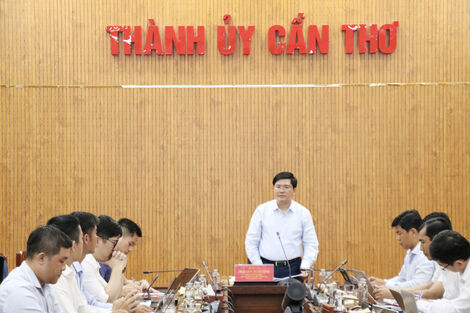 លោកង្វៀងត្វឹងអាញ់ អនុលេខាគណៈកម្មាធិការបក្សទីក្រុង ប្រធានគណៈប្រតិភូតំណាងរដ្ឋសភាទីក្រុងកឹងធើ ថ្លែងការណ៍ក្នុងឱកាសជួបពិភាក្សាការងារ។