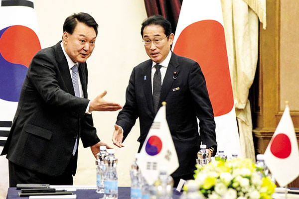 Tổng thống Hàn Quốc Yoon (trái) và Thủ tướng Nhật Kishida. Ảnh: Kyodo News