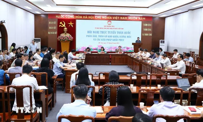 Quang cảnh Hội nghị toàn quốc về giải pháp khắc phục việc sắp xếp, tinh gọn tổ chức bộ máy Mặt trận Tổ quốc, các tổ chức chính trị-xã hội, các hội quần chúng. (Ảnh: TTXVN phát)