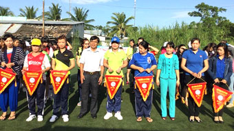 Đại diện các đội nhận cờ lưu niệm trong giải bóng đá nữ huyện Cờ Đỏ tổ chức ngày 16-10-2015. Ảnh: Thúy Hằng (Hội Liên hiệp Phụ Nữ huyện Cờ Đỏ). |
