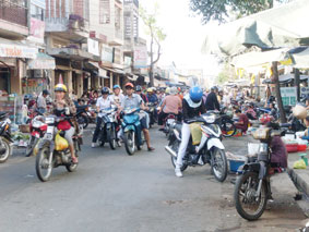 Nhiều “chợ tự phát” phát triển ngay sát các... khu chợ chính thức. Người buôn bán chiếm hẳn cả lề đường và lòng đường bán đủ mặt hàng cá, rau, mắm, muối, đường đậu. Người mua ngang nhiên đậu xe giữa đường, cò kè mặc cả, chọn lựa hàng hóa. Những con đường bị chợ chiếm luôn ngập trong rác rến và nước thải. “Ở đường Hai Bà Trưng, chúng tôi dẹp tình trạng mua bán lấn chiếm lòng lề đường như “bắt cóc bỏ dĩa”. Bị đẩy đuổi, giữ hàng hóa và phương tiện, những người mua bán vẫn tiếp tục ngay sau đó. Tình trạng này còn có bởi thói quen của cả người mua, sau đó chúng tôi xử phạt những người mua hàng đậu xe lấn chiếm lòng lề đường. Vậy là người mua và người bán hình thành “liên minh” với nhau, coi chúng tôi như những kẻ cần đối phó” - ông Nguyễn Anh Hoài, Chủ tịch UBND phường Tân An, than thở.