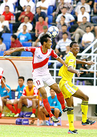 Kiên Giang (trái) nỗ lực hết sức trong cuộc chiến trụ hạng. Ảnh: Dương Thu |