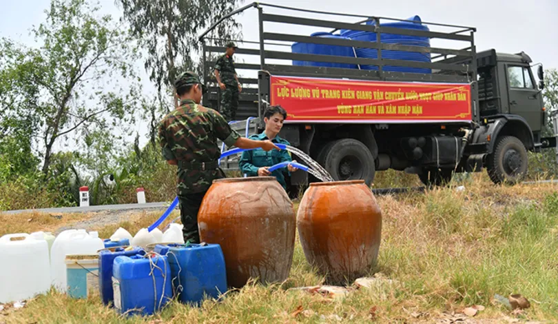 Bộ Chỉ huy Quân sự tỉnh Kiên Giang mang nước hỗ trợ tận nơi cho người dân vùng thiếu nước ngọt.
