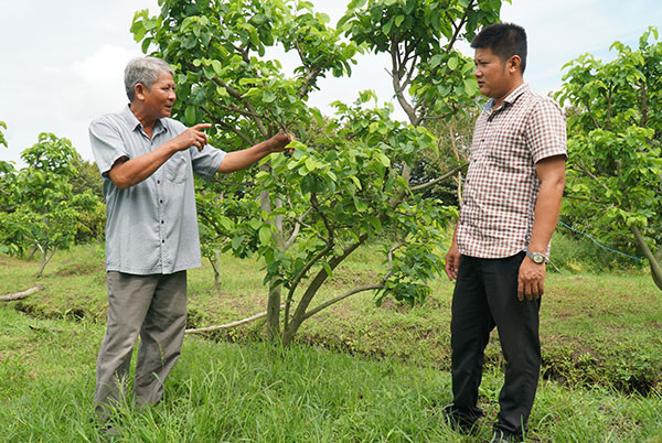 Anh Nguyễn Ðức Duy, Chủ tịch Hội Nông dân xã (bên phải) tích cực hỗ trợ nông dân phát triển mô hình trồng mãng cầu na.