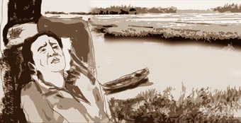 Nước thuận dòng xuồng chèo đi êm ru, vừa lọt vô vàm kinh Ngã Giữa trời cũng vừa đứng bóng, dòng kinh bị cỏ nga, lục bình hai bên lấn át chỉ còn đường nước nhỏ xíu vừa cho chiếc xuồng lướt tới. Hai bên bờ kinh sậy mọc cao ngất ngưỡng, vắng ngắt bóng người, xa xa vài cụm khói bốc lên như báo hiệu có người cũng lần về lo mùa vụ. Anh nhắm hướng cây gáo ranh đất mình ở mé kinh tấp xuồng vô. Con chim bói cá vừa vớt được con mồi bay vèo qua mũi xuồng làm giựt mình con phèn chực sủa.