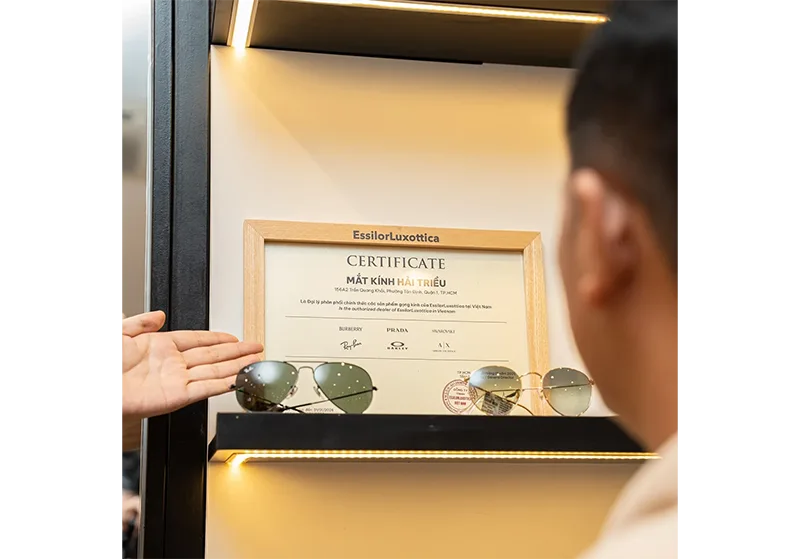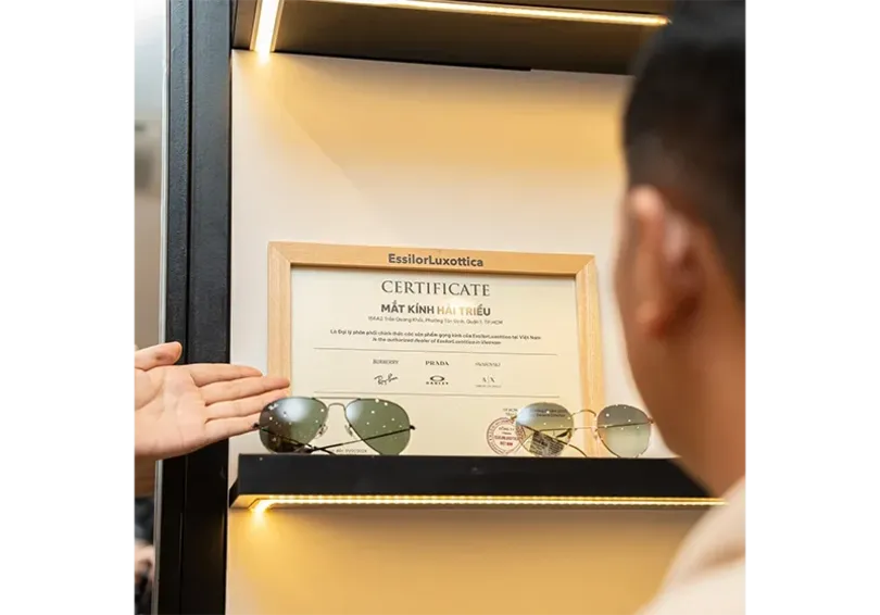 Kính Hải Triều hiện là đại lý ủy quyền của tập đoàn sở hữu RayBan (EssilorLuxottica). Tại mỗi showroom trong hệ thống - từ Trần Quang Khải (quận 1 cũ) đến Phan Văn Trị (Gò Vấp cũ) - Hải Triều trưng bày công khai Giấy chứng nhận đại lý ủy quyền. Khách hàng có thể kiểm tra trực tiếp ngay khi bước vào cửa hàng.