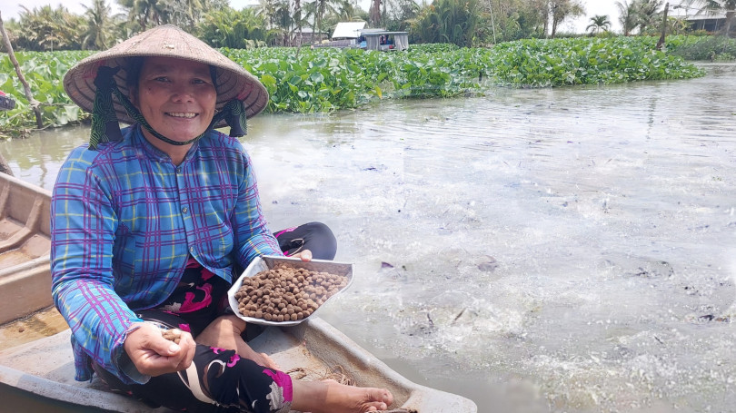 Bà Nguyễn Thị Kim Huệ cho đàn cá dưới bến sông ăn.