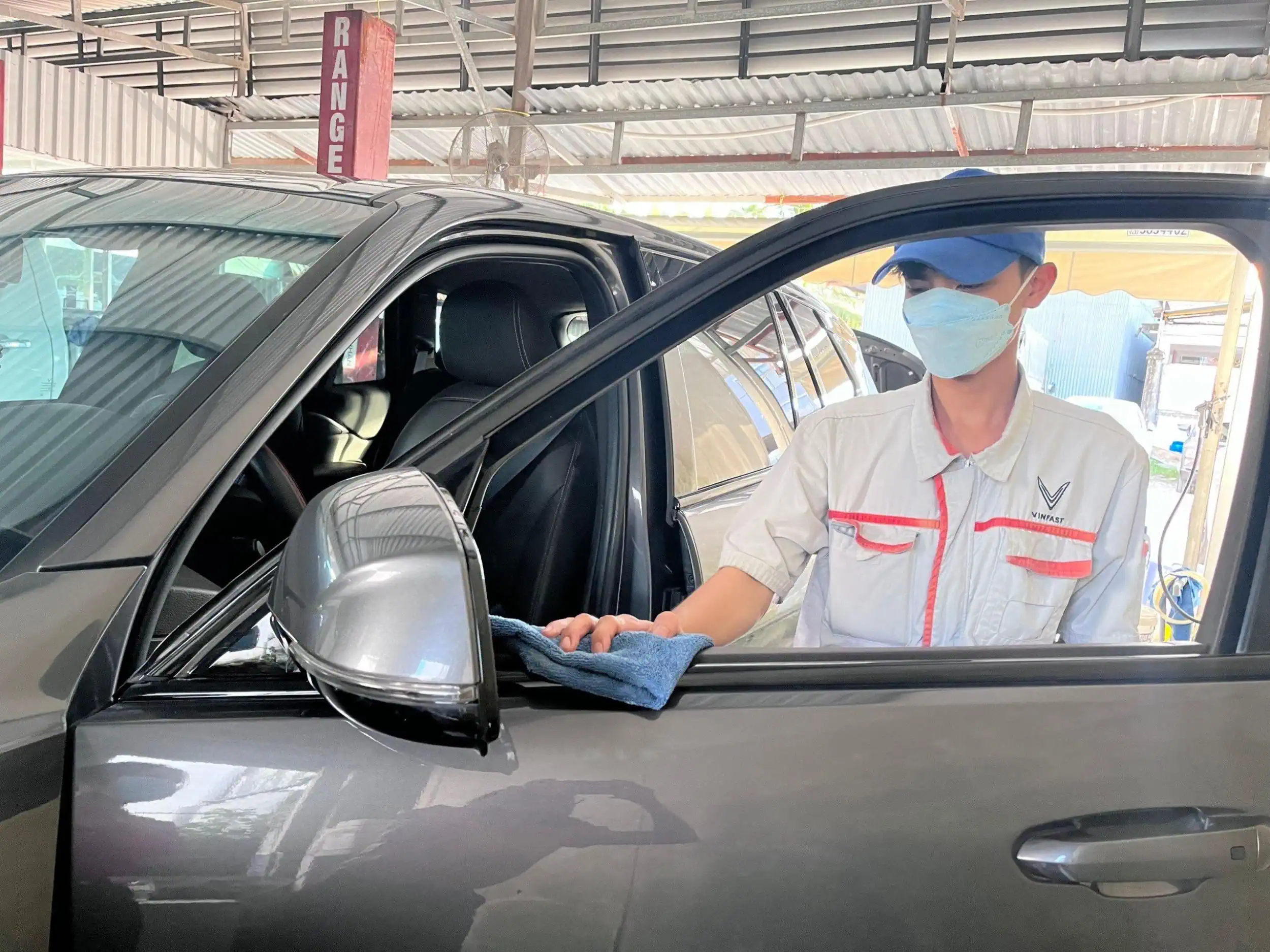 Nhân viên Đại lý VinFast - Chevrolet chăm sóc xe cho khách hàng những ngày giáp Tết.