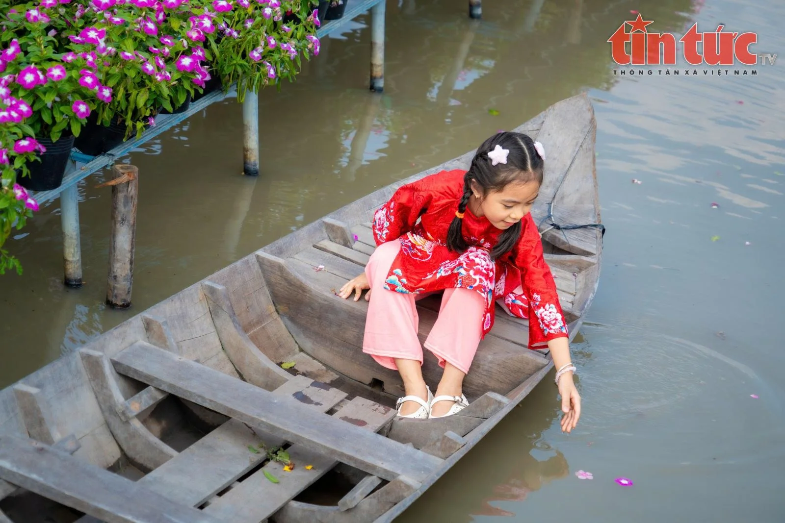 Du khách nhí trải nghiệm chèo thuyền giữa các luống hoa đủ sắc màu để chụp ảnh check in.