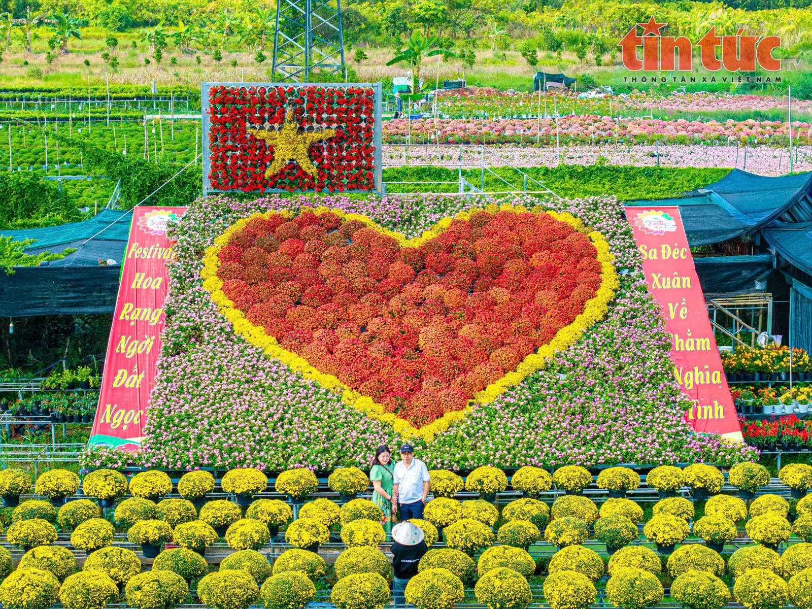 Du khách tạo dáng với trái tim hoa khổng lồ tại làng hoa Sa Đéc để lưu giữ kỷ niệm Tết sớm tại làng hoa Sa Đéc.