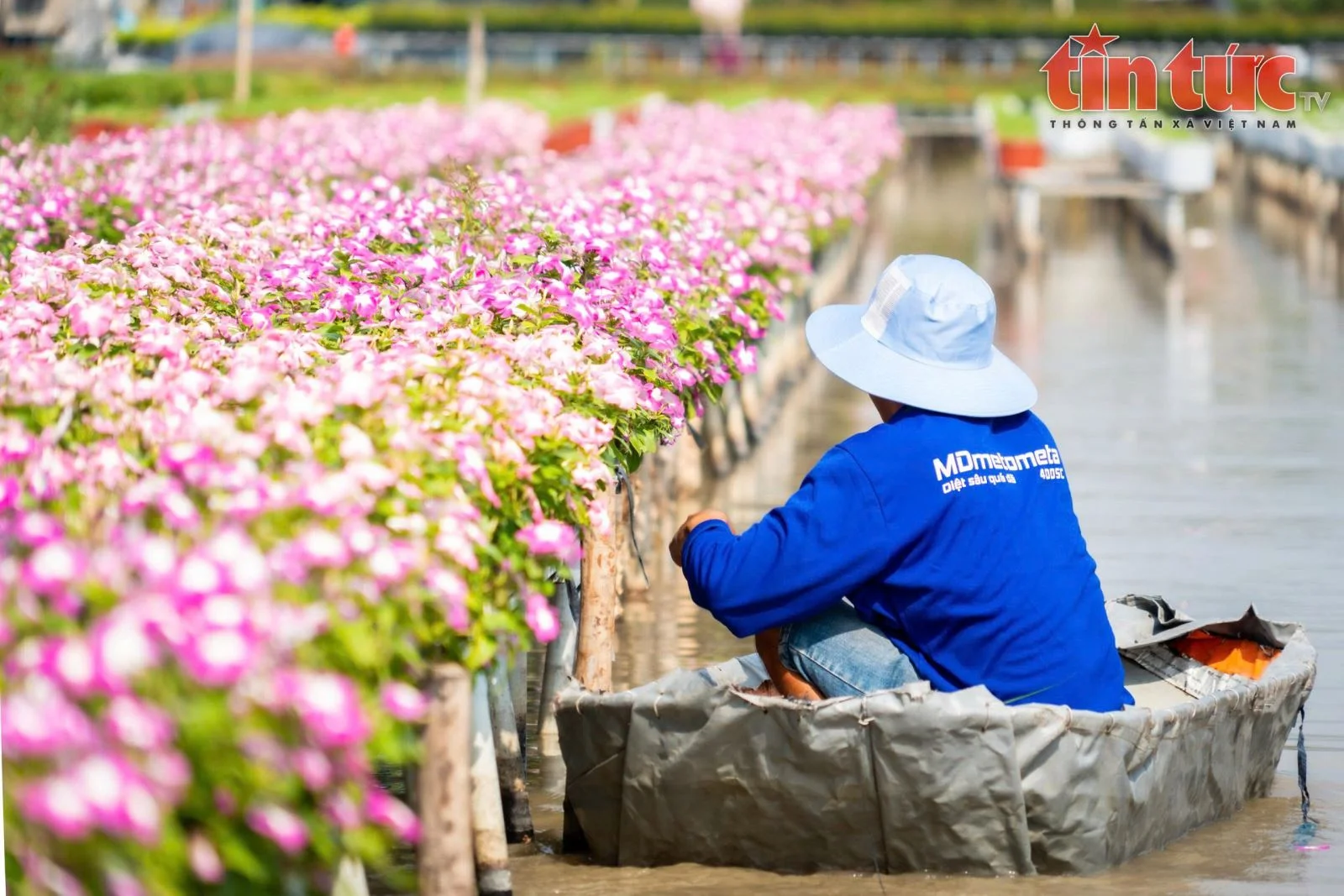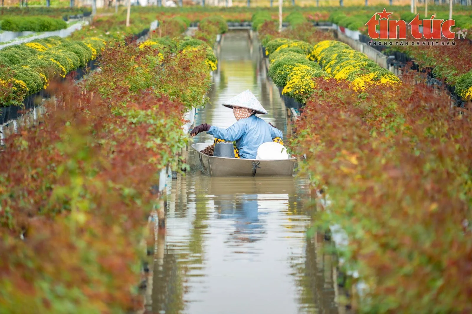 Người trồng hoa chèo xuồng chăm sóc từng chậu hoa đặt ngay ngắn trên giàn giữa vườn.