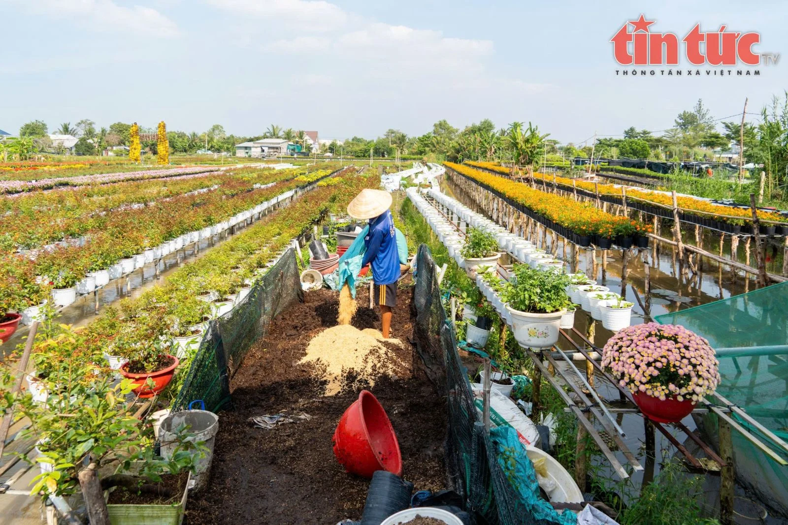 Tại từng nhà vườn, người lao động tranh thủ tỉa cành, chiết nhánh, bứng cây sang chậu lớn, người kéo dây, bơm nước tưới hoa để hoa cho nở đúng vụ Tết. Các loại hoa ngắn ngày như: dừa cạn, xác pháo, sao nhái, vạn thọ được chăm sóc song song với những loại dài ngày như cúc mâm xôi, hoa hồng - những mặt hàng chủ lực của thị trường Tết.