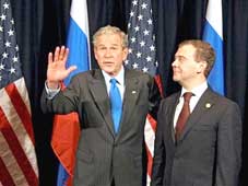 Người phát ngôn Nhà Trắng Dana Perino cho biết hai nhà lãnh đạo đã bàn về cuộc khủng hoảng tài chính toàn cầu hiện nay cũng như các vấn đề an ninh quốc tế, trong đó có vấn đề hạt nhân Iran, Gruzia, hải tặc Somalie. Hai bên nhất trí rằng Nga - Mỹ cần tiếp tục hợp tác về vấn đề Iran sau khi Tổng thống đắc cử Mỹ Barack Obama nhậm chức. Hai nhà lãnh đạo cũng nhất trí giao nhiệm vụ cho ngoại trưởng hai nước hợp tác để vận động quốc tế ủng hộ một chiến lược mạnh mẽ chống cướp biển.