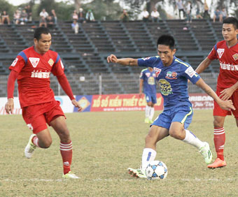 Ngọc Điểu (trái) trong lần hiếm hoi được đá chính trận XSKT Cần Thơ gặp Hoàng Anh Gia Lai ở V.League 2015. Ảnh: Nguyễn Minh. |
