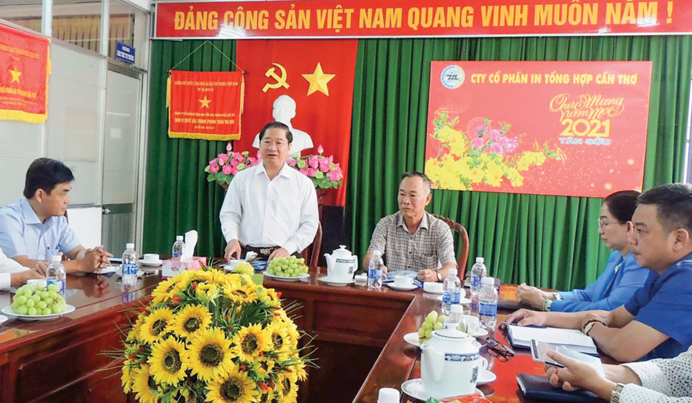 Đồng chí Trần Việt Trường, Phó Bí thư Thành ủy, Chủ tịch UBND thành phố chúc Tết tại Công ty CP In Tổng hợp Cần Thơ. Ảnh: MỸ THANH