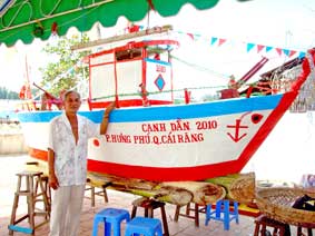 Ông Võ Văn Nên, 62 tuổi, Trưởng Ban Tế tự Miễu Bà Xóm Chài và chiếc bè tống ôn năm Canh Dần 2010. |