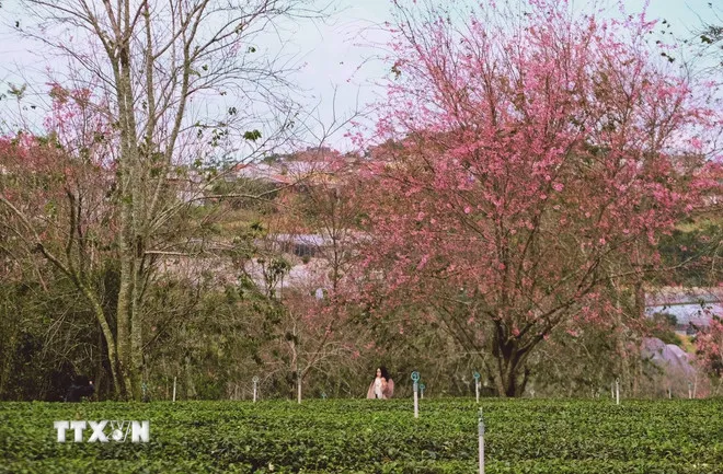 Hàng ngàn cây mai anh đào tại đồi chè Cầu Đất đã nở rộ thu hút du khách đến thưởng lãm. (Ảnh: Nguyễn Dũng/TTXVN)