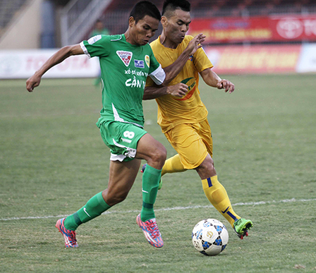 Văn Thắng (trái) ghi bàn giúp XSKT Cần Thơ có trận thắng quan trọng trước Hải Phòng. Ảnh: NGUYỄN MINH