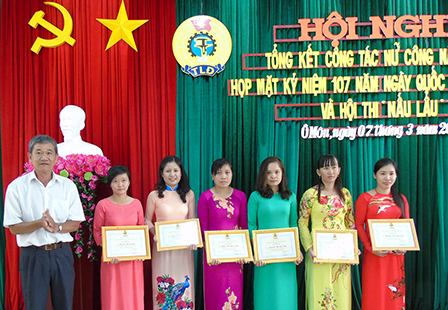 Lãnh đạo Liên đoàn Lao động quận Ô Môn trao Giấy khen cho các công đoàn viên có thành tích xuất sắc trong phong trào thi đua "Giỏi việc nước đảm việc nhà" năm 2016.