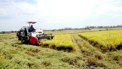 Thu hoạch lúa đông xuân tại cánh đồng mẫu lớn, ấp An Phú, xã An Khánh, huyện Châu Thành, tỉnh Đồng Tháp. Ảnh: THIỆN KHIÊM |