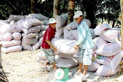 Thời gian qua, nhờ được doanh nghiệp tham gia CĐL bao tiêu sản phẩm mà nhiều nông dân ở TP Cần Thơ bán lúa được giá cao hơn thị trường từ 100 - 200 đồng/kg so với cùng thời điểm. Ảnh: KHÁNH TRUNG |