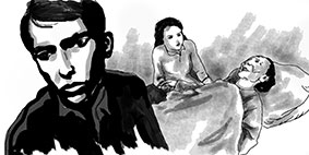 Đang bối rối thì bất ngờ cúp điện. Không gian chìm trong bóng tối và lặng im. Trong hoàn cảnh này, bóng tối và sự im lặng không còn là bạn đồng hành với nó nữa. Nó thấy hoang mang, cố căng tai ra nghe ngóng, đề phòng. Nó nghe trên giường có tiếng trở mình nặng nhọc. Với giác quan nhạy cảm, nó biết người nằm trên giường đang bệnh nặng. Bỗng người nó như bị đông cứng lại, khi trên giường có tiếng trầm đục phát ra: "Cho ngoại ly nước