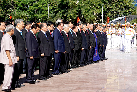 Đoàn đại biểu Ban Chấp hành Trung ương Đảng, Quốc hội, Chủ tịch nước, Chính phủ, Ủy ban Trung ương Mặt trận Tổ quốc Việt Nam và tỉnh Hưng Yên tưởng nhớ Tổng Bí thư Nguyễn Văn Linh. Ảnh: TH, Dangcongsan.vn