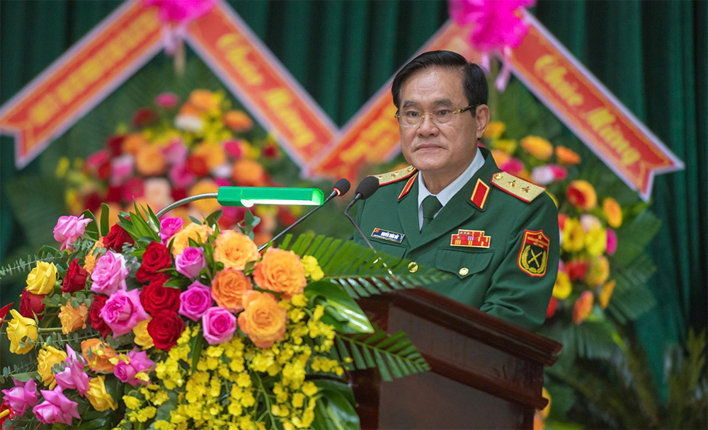 Trung tướng Nguyễn Xuân Dắt, Phó Bí thư Đảng ủy, Tư lệnh Quân khu 9, trao tặng bức trướng đến Đảng ủy, Ban Chỉ huy Lữ đoàn Công binh 25. Ảnh: CHUNG CƯỜNG