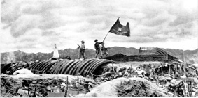 Cờ “Quyết chiến, quyết thắng” phấp phới tung bay trên nóc hầm Tướng De Castries. Ảnh: Việt Nam 30 năm chiến tranh giải phóng 1945-1975. NXB Thông Tấn 2004 |