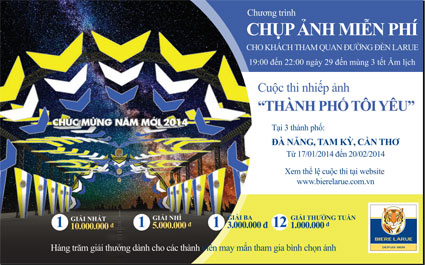 Trong dịp Tết Giáp Ngọ 2014, 03 con đường Lê Duẩn (Đà Nẵng), Phan Châu Trinh (Tam Kỳ, Quảng Nam) và Trần Văn Khéo (Cần Thơ) sẽ rực sáng với ánh đèn và trang trí nghệ thuật của bia Larue theo chủ đề "Mừng Xuân Hội Ngộ". Kéo dài từ 20/01 cho đến 07/02/2014, chương trình với hàng triệu bóng đèn LED xanh, trắng, vàng được thiết kế theo hình các cánh én tụ hội, lại vừa mang dáng dấp của những tia pháo hoa nở rộ. Những con đường quen thuộc này sẽ là nơi mọi người tản bộ cùng người thân, bạn bè, lưu lại khoảnh khắc của tình thân, tình bằng hữu với chương trình chụp ảnh miễn phí từ ngày 29 đến mùng 3 âm lịch. Bên cạnh đó, 03 tuyến đường cũng sẽ là nguồn cảm xúc để mọi người tham dự cuộc thi nhiếp ảnh "Thành phố tôi yêu" tại TP. Đà Nẵng, TP. Tam Kỳ và TP. Cần Thơ từ 20/01 đến 20/02/2014. Thông tin chi tiết có tại: www.bierelarue.com.vn.