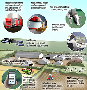 Mặc dù xe kéo không người lái chưa được sản xuất thương mại, nhưng người nông dân có thể giải phóng sức lao động nhờ loại xe kéo được điều hướng qua vệ tinh và sóng radio sắp được tung ra thị trường. Theo đó, chiếc xe do con người điều khiển sẽ dẫn đường cho chiếc xe không người lái còn lại chạy phía sau và làm nhiệm vụ giống như chiếc xe đi trước. Còn với máy bay không người lái, nhà nông có thể chụp lại hình ảnh trang trại để theo dõi hoa màu, giúp họ nhanh chóng và dễ dàng phát hiện cỏ dại, xác định khu vực cần trồng lại, cần bón phân hoặc dùng thuốc trừ sâu. Nó còn hữu ích trong việc xua đuổi chim ăn hạt. Được biết, các nhà nghiên cứu tại Đại học Illinois (Mỹ) cũng đang sử dụng máy bay không người lái để chụp ảnh hoa màu từ trên cao ở các trang trại thí nghiệm của họ.