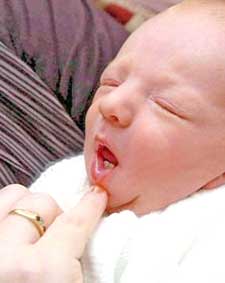hai chiếc răng cửa hoàn chỉnh ở hàm dưới (ảnh). Bé Oliver James - con trai của anh Joanne và chị Lee được sinh mổ và nặng 3,5 kg. Nha sĩ cho biết răng của bé có hai khả năng, có thể tự rụng để trả lại chỗ cho răng mới hoặc sẽ phát triển thành răng vĩnh viễn. Ba mẹ Oliver cho biết từ khi hay tin bé sơ sinh có răng, nhiều người tò mò kéo đến để ngắm bé. Về phần mình, mẹ Oliver có lẽ sợ con cắn đau nên ngay từ đầu chị quyết định cho bé bú bình.
