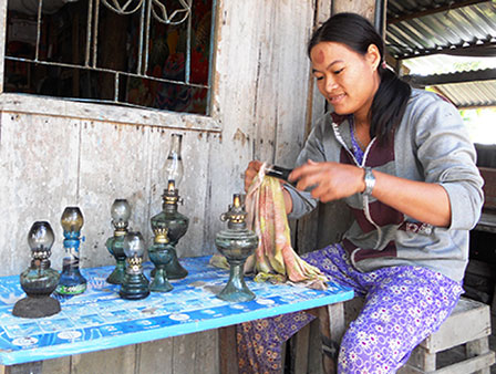 Chị Nguyễn Thị Hiếu Hiền sửa chữa, vệ sinh những chiếc đèn dầu để thắp sáng vào buổi tối.